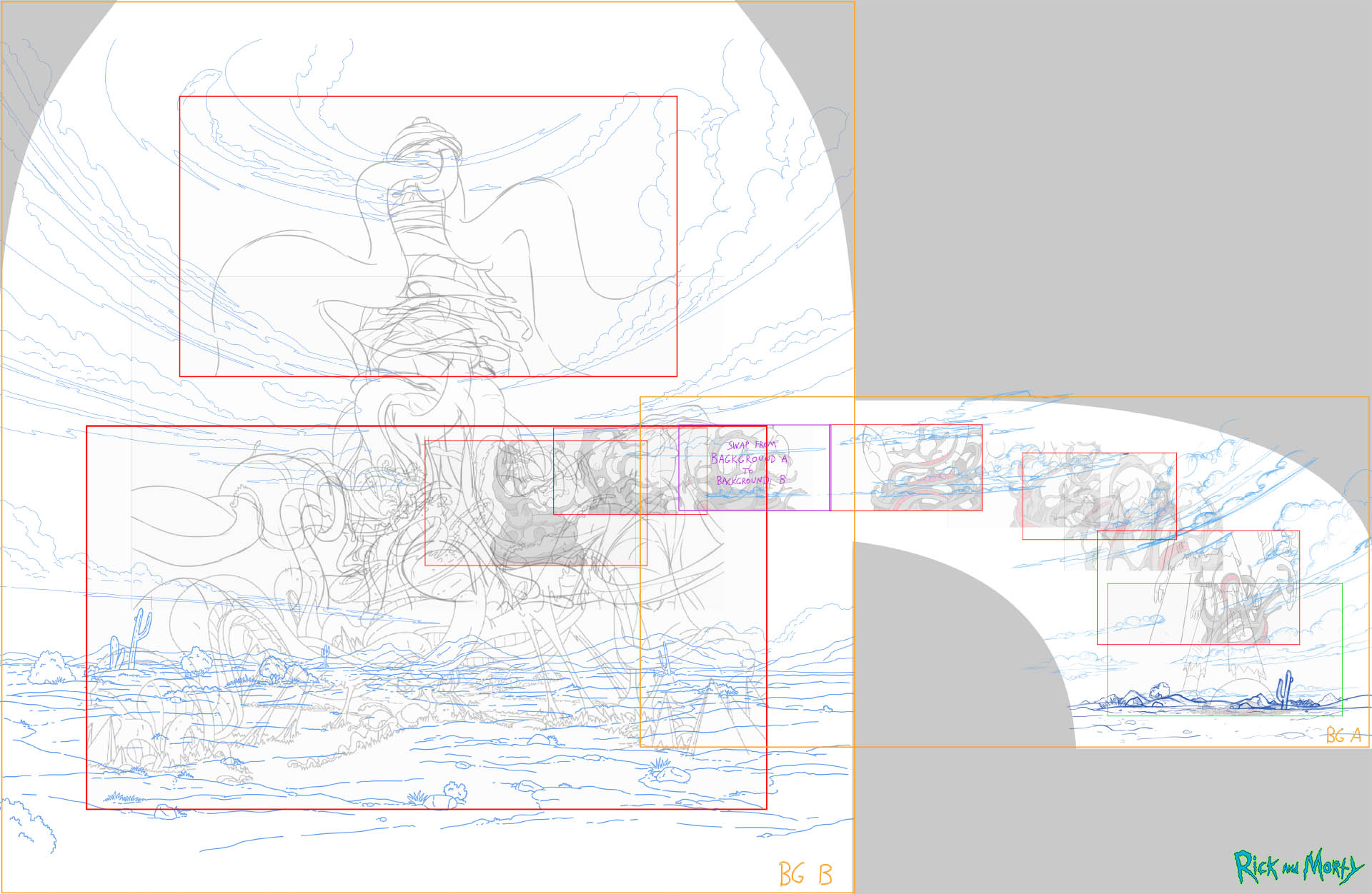 Background art and layout for Studio Yotta for the ferrofluid sequence in Rick and Morty S4E1.